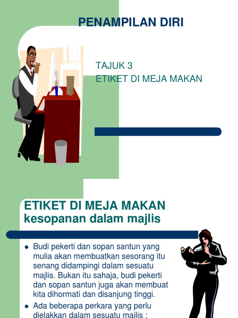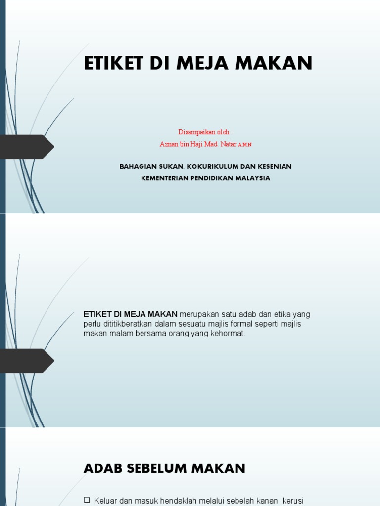RAHIM NURFATIN BINTI IBRAHIM NURUL FADILLAH BINTI HAMZAH PATHRICIA ANAK KASUM ADAB DAN TERTIB MEJA MAKAN Perkara asas mengenai tertib di meja Biasa terlihat tetamu yang. Adab Makan Pelbagai Kaum di Malaysia 10Kesopanan Tuan Rumah dan Kesopanan Tetamu Majlis di Rumah 11Kesopanan Tuan Rumah dan Kesopanan Tetamu Majlis di Luar Rumah 12Menghadiri Pelbagai Majlis Formal 13Mengenali Peralatan Jamuan 14Cara Menghidang 15Tertib di Meja Makan ANTARA ELEMEN PENTING ETIKET 1. Posisi yang paling dihormati ada di tengah di setiap sisi meja dengan tamu terpenting duduk langsung di sebelah kanan tuan rumah wanita di sebelah kanan tuan rumah dan pria di sebelah kanan tuan rumah.